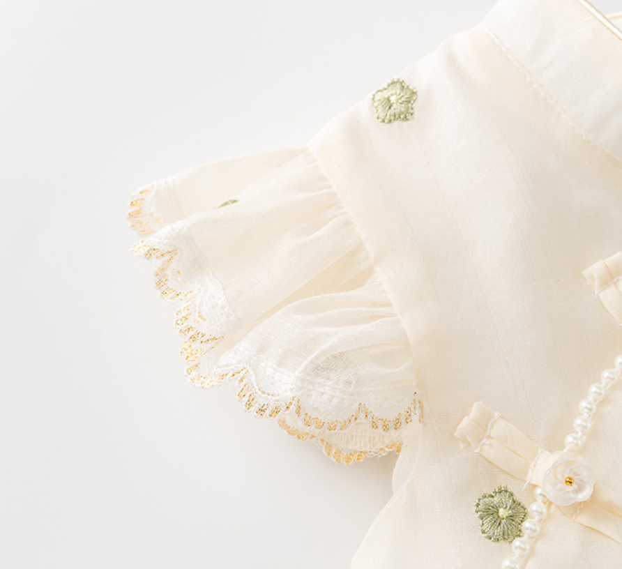 Pearl-trimmed curved detailing with mini bow accents