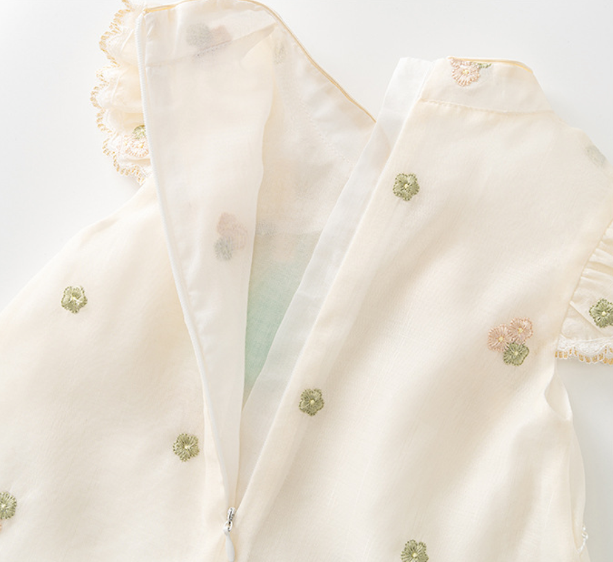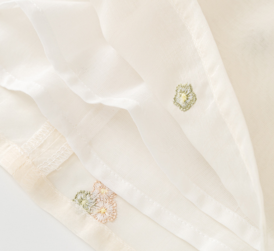 - Soft sheer fabric with delicate floral embroidery